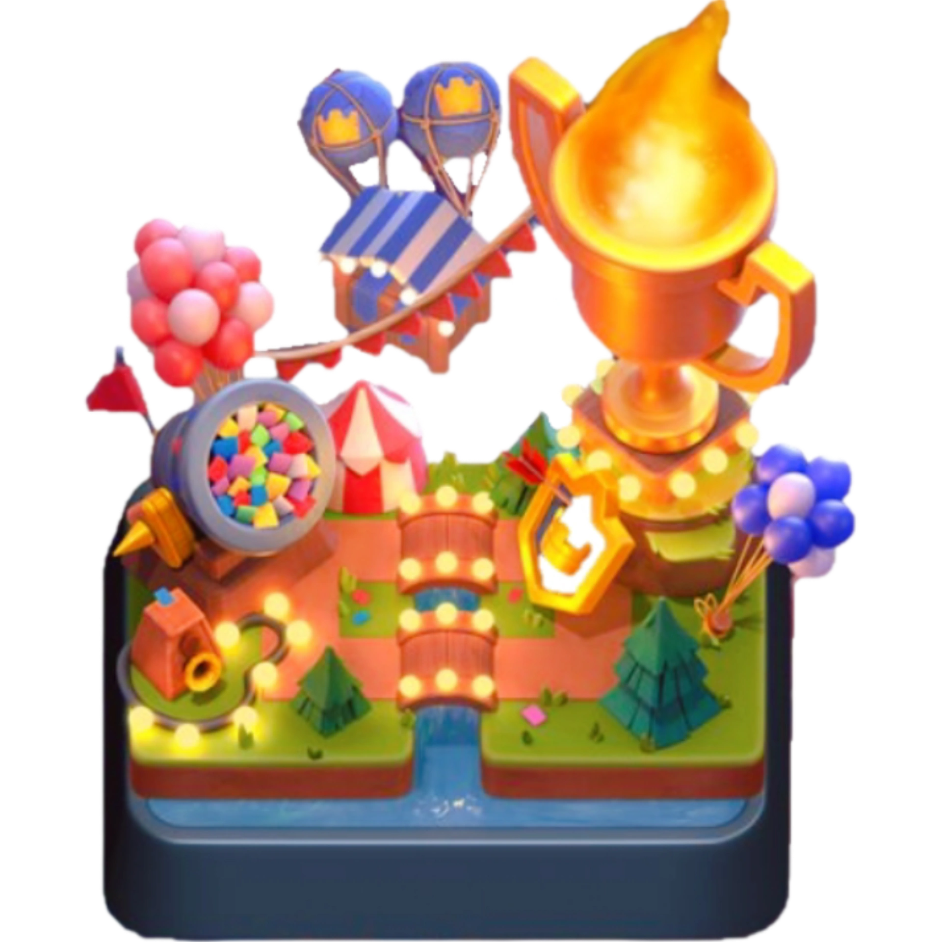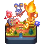 игрок перейдёт на арену "БЛИНЧИКИ!" и уже не сможет вернуться обратно. Выглядит как зелёное поле с рекой, через которую проложен мост с фонарями, на котором стоит огромный трофей с очагом пламени на самой вершине. Рядом с ним чуть ниже виден щит с золотой короной, который по виду спереди напоминает иконку за достижение лиги "Королевский чемпион" в Легендарном пути. Слева от него находится пушка со всякими разноцветными фигурами, сзади которой прикреплено несколько розовых шариков и рядом стоит небольшой купол в красно-белую полоску, который похож на цирковой. В воздухе на двух синих воздушных шариках с изображением короны летает магазин. Абсолютно так же выглядела Легендарная арена на момент 39-го сезона Pass Royale (сентябрь 2022 г).